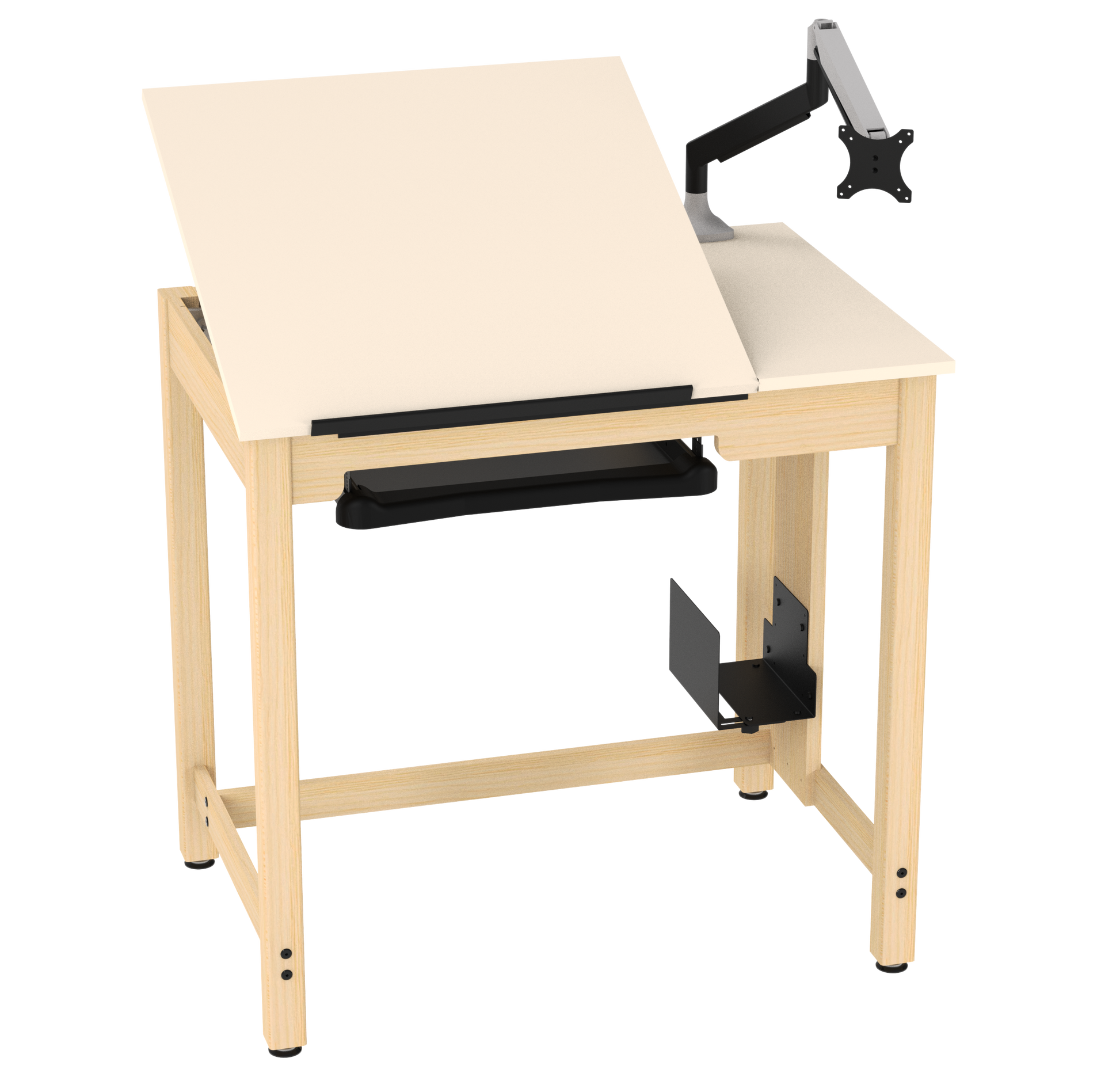 In classrooms where students are sketching, drafting or designing, the right workspace matters. Our Draftsman Drawing Table offers a tilted work surface that supports proper posture during long periods of detailed work, while the solid light hardwood frame stays steady – even as the angle adjusts. The worksurface is built to handle everyday wear and tear, from pencil marks to repeated erasing and tool use. Integrated storage keeps tools within reach and workspaces clutter-free, helping students stay organized and on task. This wood drafting table is a practical solution for classrooms that need durable, everyday functionality without sacrificing comfort or organization.