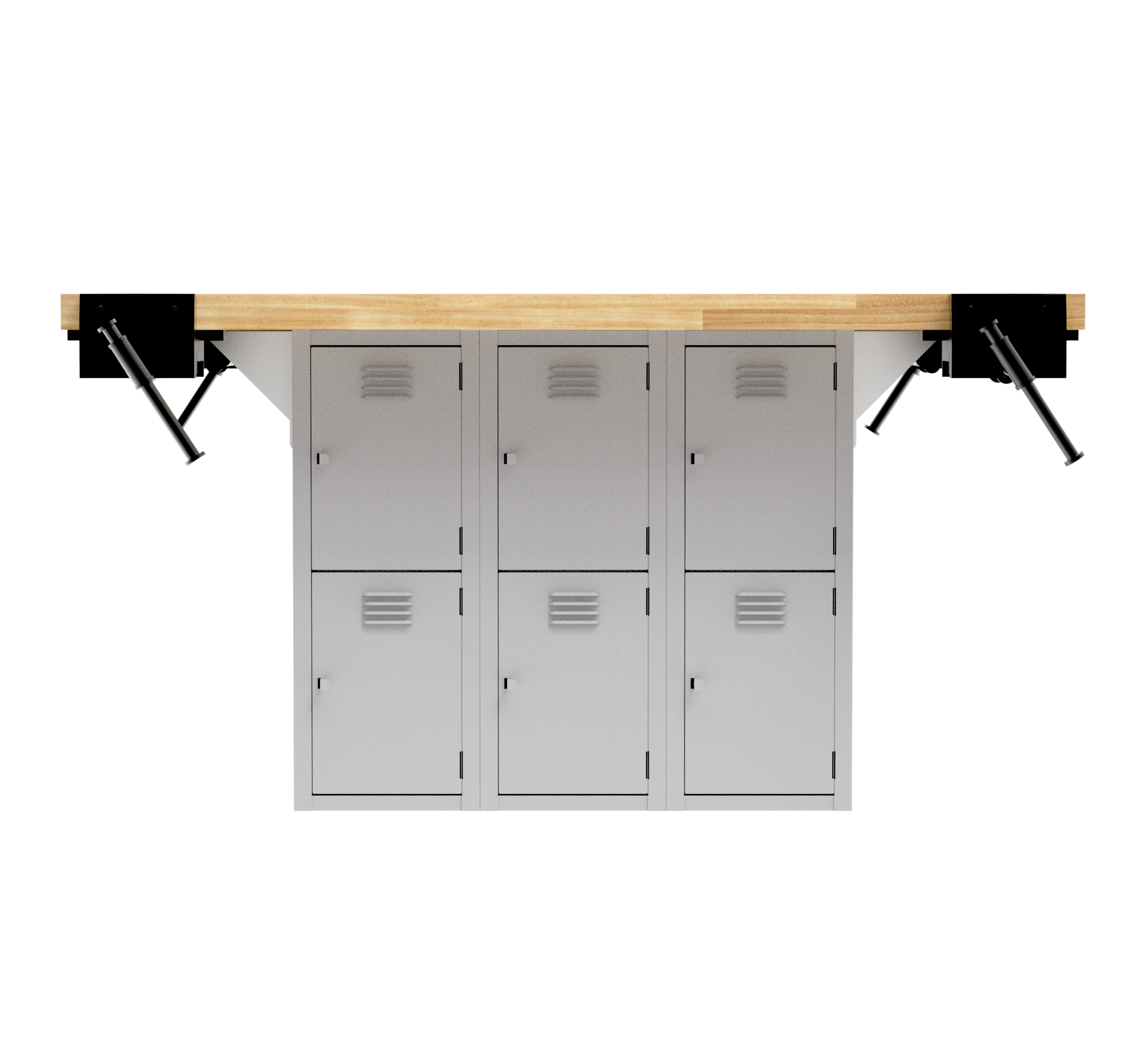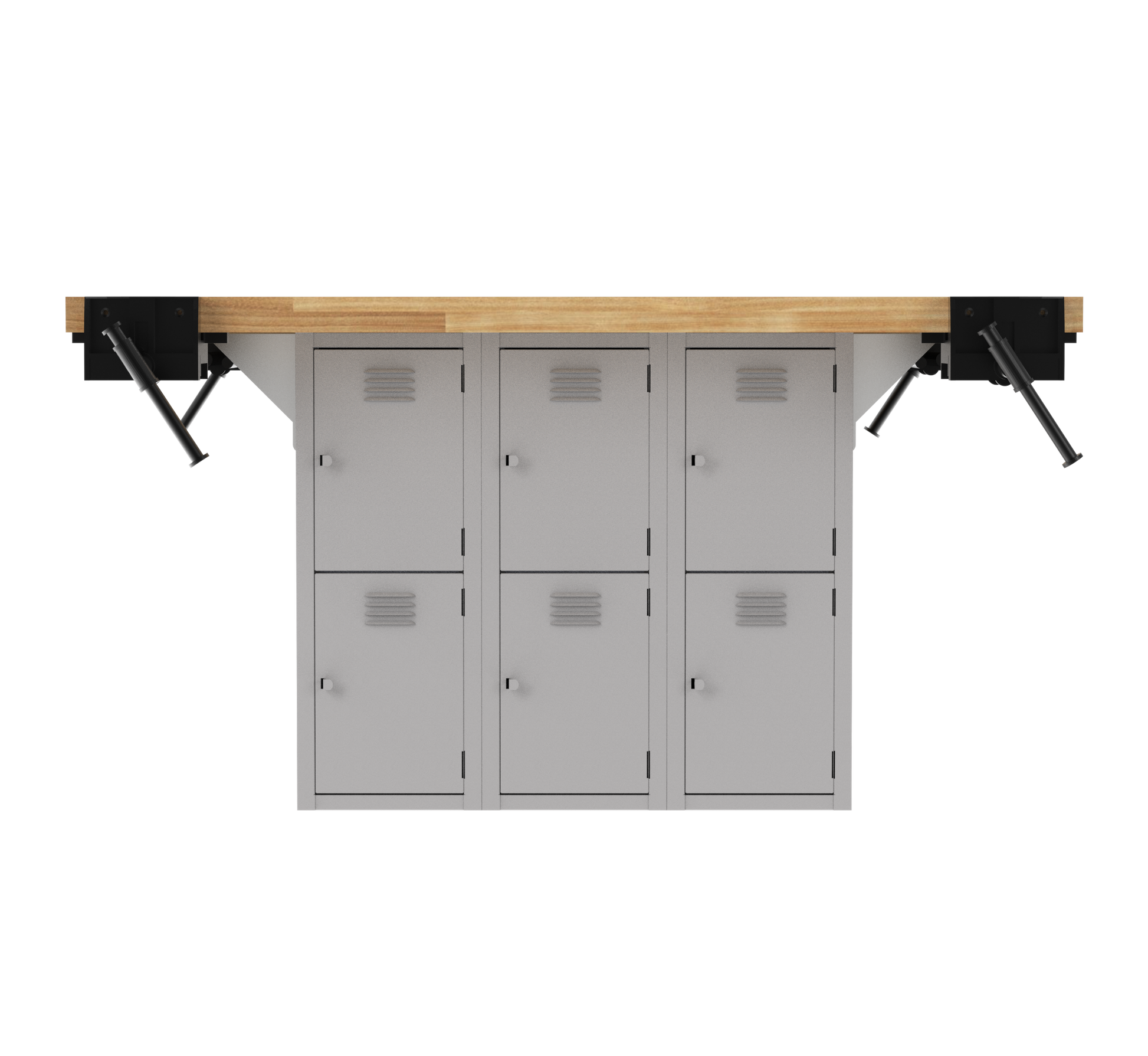 The Forum Industrial Arts Four-Station Steel Workbench brings structure and storage together in one solid solution for busy classrooms. Designed to support up to four students at a time, it’s a smart choice for shop classes, CTE programs or any space where hands-on learning happens daily. Twelve built-in steel lockers provide secure, individual storage for tools and materials – keeping supplies organized and ready for use. The durable Light Hardwood butcher block top offers a stable surface for all kinds of projects, and optional vises can be added to each station for more technical tasks that require a firm grip. With a rugged steel base and thoughtful design, this steel workbench helps students stay focused, organized and ready to work.
