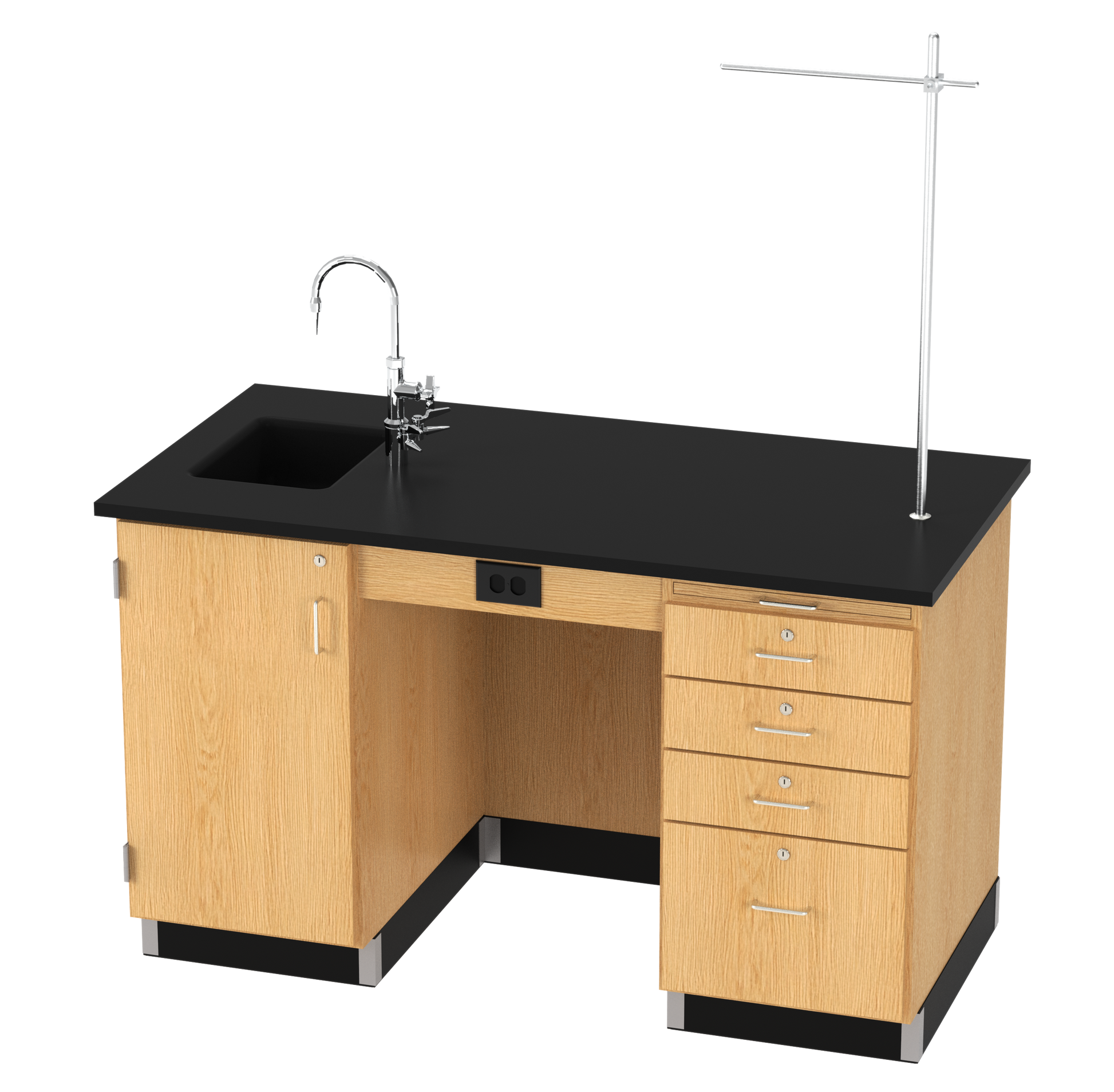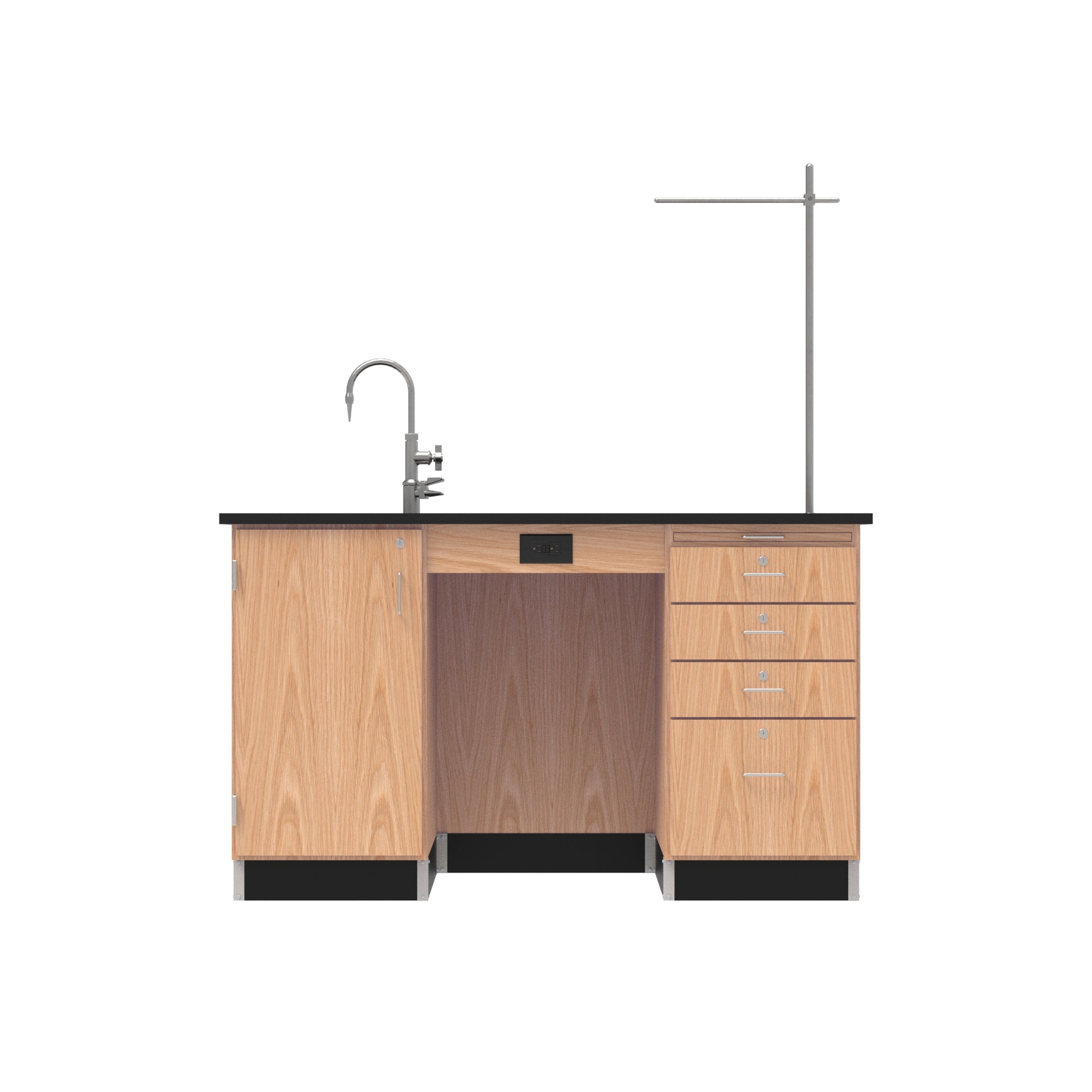 This all-in-one Kinetic Instructor Desk is made for teaching through demonstration. With a spacious work surface and built-in utility features, it’s ready to support everything from everyday lessons to hands-on experiments. The integrated epoxy resin sink, combination cold water and gas fixtures, and polypropylene trap make it easy to run live demos right at the desk. A Greenlaw arm provides additional support for glassware or tools, giving instructors even more flexibility. Storage is secure and practical, with locking drawers and a cupboard to keep everything from worksheets to safety gear organized. A pull-out writing board offers a convenient spot to take notes or hold reference materials while teaching. Whether you're prepping experiments or guiding students through a new concept, this instructor desk gives you the tools and setup to stay focused and in control.