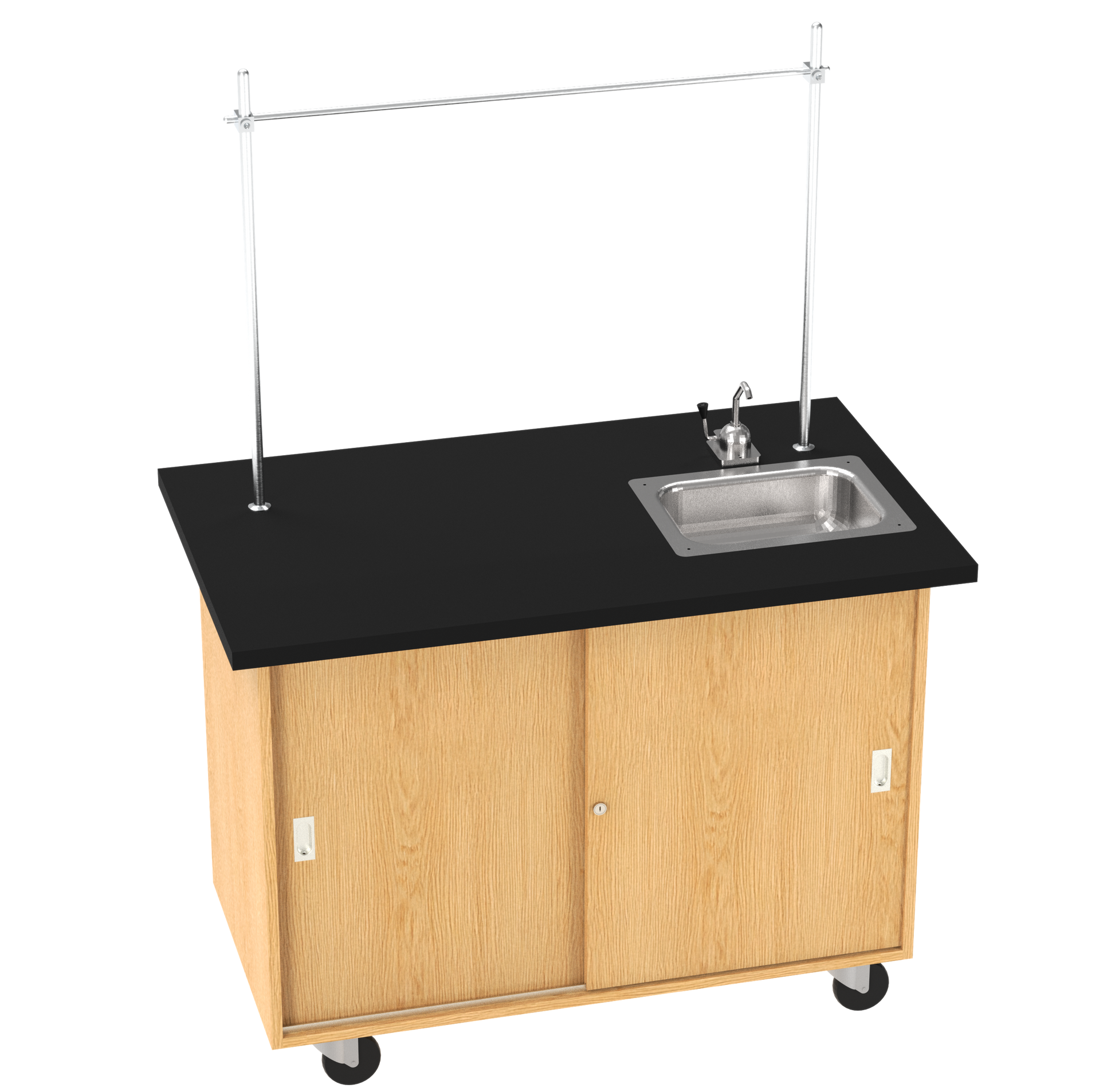Our Kinetic Mobile Demo Tables are designed with science educators in mind. Whether you're conducting a chemistry experiment, modeling a physics concept or prepping a biology station, these mobile units provide the functionality and flexibility needed to support hands-on learning. Each table is constructed from solid oak hardwood and veneers with a chemical-resistant, earth-friendly UV finish. Integrated features like a stainless steel sink, hand pump, water storage system and grounded electrical outlet let you deliver complete demonstrations without relying on a fixed lab space. Built-in storage, ranging from drawers and shelves to pegboards and tote trays, keeps equipment and materials organized and readily accessible. Top surfaces vary by model, with options including high-pressure laminate for general classroom use or ChemGuard for added chemical resistance in lab settings. A mirror or mirror/markerboard combination can be added to any model, making it easier for students to view demonstrations and follow along with written notes in real time. With multiple configurations available, from compact setups to XL models with advanced storage and extra worksurface, there's a Kinetic Demo Table to support every lab-based lesson.
