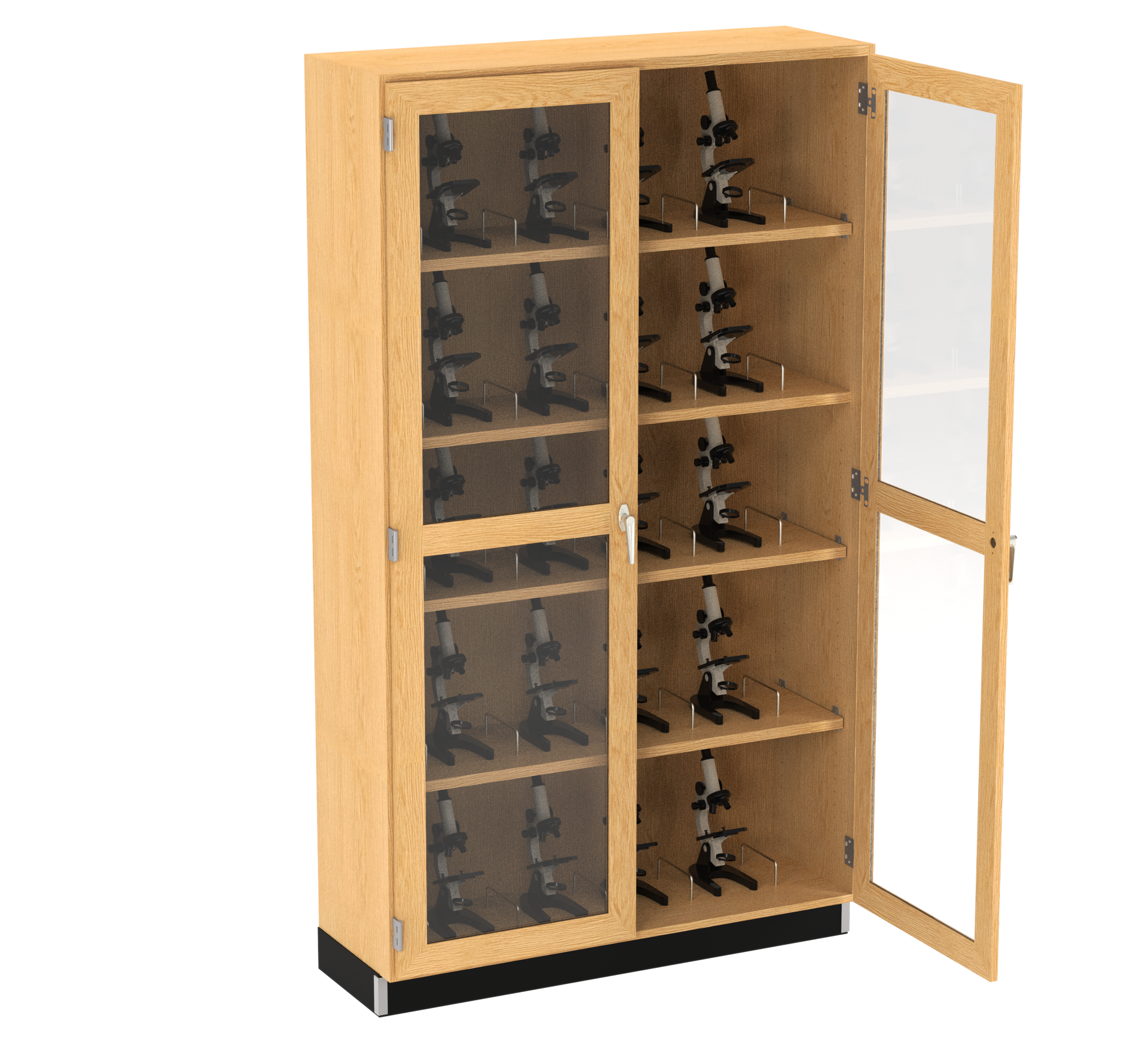 Compartments | Two oak-framed doors with 3/16" tempered glass: three-point locking handle system; 1" thick shelves hold up to 30 microscopes; three adjustable shelves and two fixed shelves with adjustable dividers |